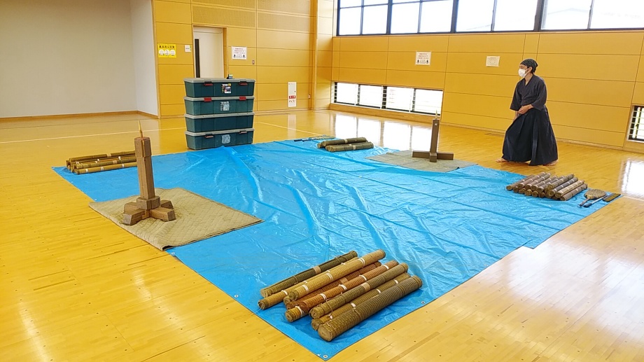 手の内・間合いの稽古を(半巻きの巻藁を)居合の形で斬ります。