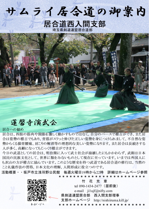 西入間支部は、「公益財団法人 埼玉県剣道連盟居合道部」に所属する道場です。地域は坂戸市を中心に、近隣市町村から稽古に通う会員が主で、地元公民館を借用して週4日ほど稽古に明け暮れています。